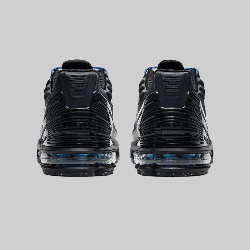 Revive a classic with the Nike Air Max Plus 3. Known for its iconic Tuned Air technology, this silhouette features the signature TPU fused to the upper for a futuristic, high-velocity look. The deep black upper is accented with striking blue hits on the laces and Air units, offering a bold contrast that stands out. Designed for stability and unrivaled cushioning, these sneakers bring the legendary '90s aesthetic into the modern era with premium materials and a aggressive stance.